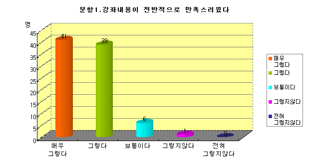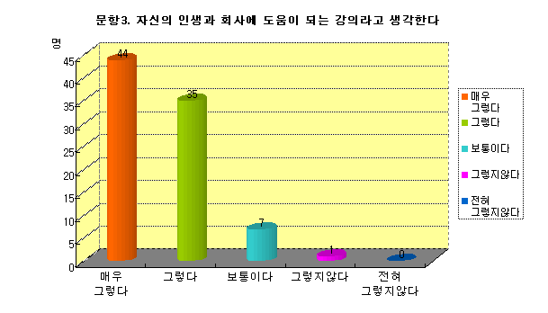 ¢ºÃÑÀÀ´äÀÚ 87¸í Áß ¸Å¿ì±×·¸´Ù(44%), ±×·¸´Ù(35), º¸ÅëÀÌ´Ù (7%), ±×·¸Áö¾Ê´Ù(1%), ÀüÇô±×·¸Áö¾Ê´Ù(0%)·Î
