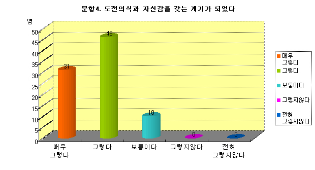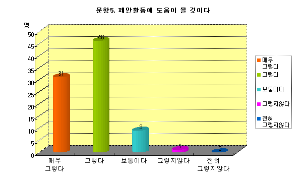 ¢ºÃÑÀÀ´äÀÚ 87¸í Áß ¸Å¿ì±×·¸´Ù(31%), ±×·¸´Ù(46%), º¸ÅëÀÌ´Ù (10%), ±×·¸Áö¾Ê´Ù(0%), ÀüÇô±×·¸Áö¾Ê´Ù(0%)·Î