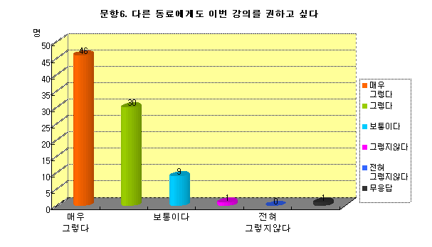 ¢ºÃÑÀÀ´äÀÚ 87¸í Áß ¸Å¿ì±×·¸´Ù(46%), ±×·¸´Ù(30%), º¸ÅëÀÌ´Ù (9%), ±×·¸Áö¾Ê´Ù(1%), ÀüÇô±×·¸Áö¾Ê´Ù(0%),